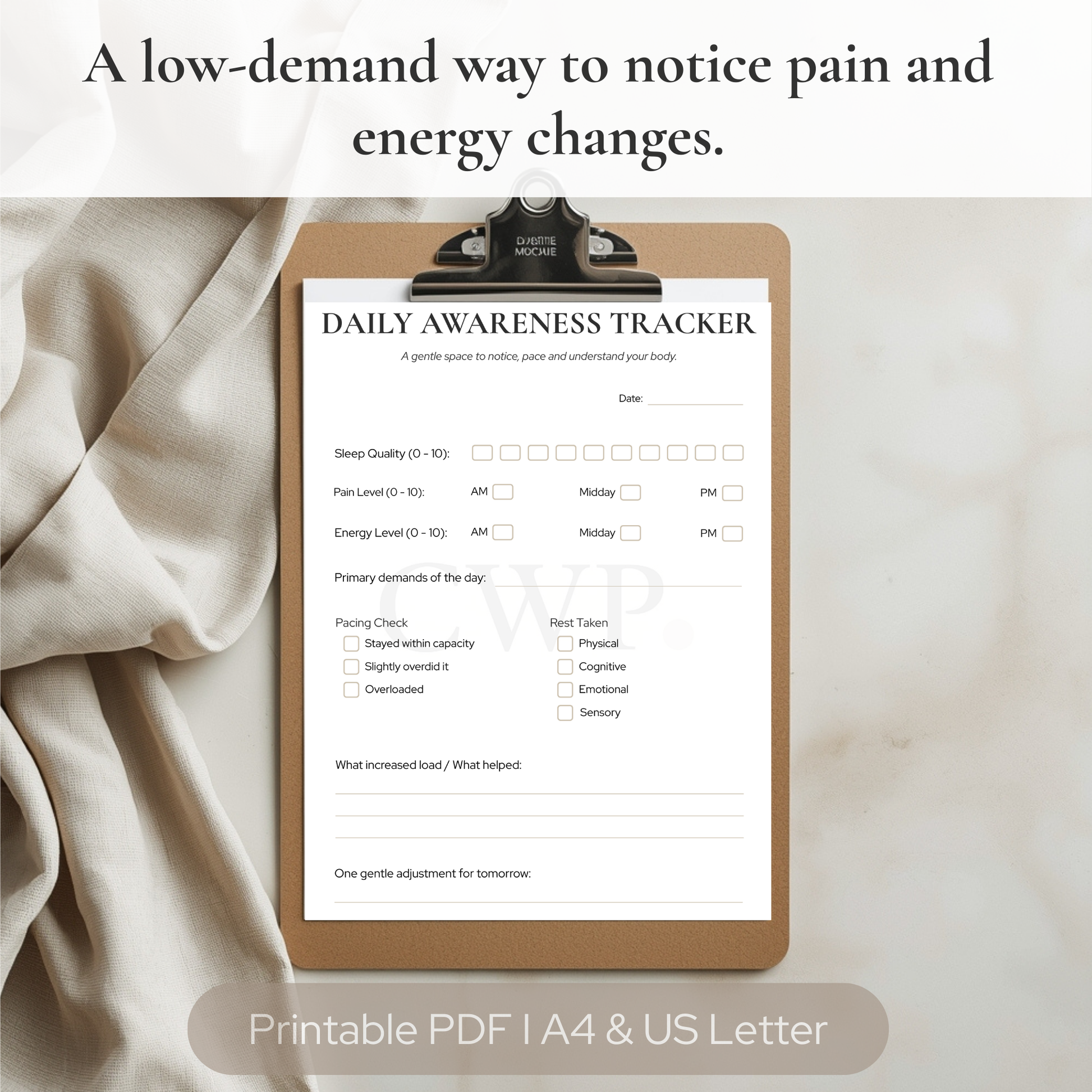 A low-demand daily tracker designed to help you notice pain, energy, and pacing without pressure to improve or push through.